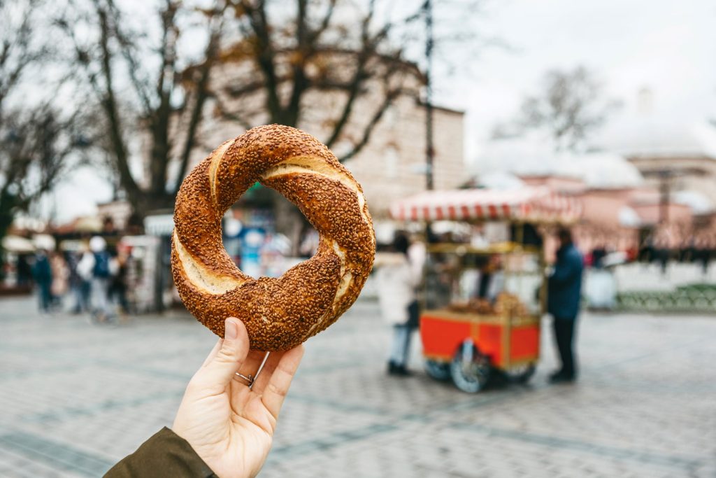 Simit is a beloved Turkish street food that’s often called a “Turkish bagel” due to its round shape and sesame seed topping. However, unlike bagels, simit is dipped in molasses before baking, which gives it a slightly sweet, caramelized crust. It has a crisp exterior and a soft, chewy interior. Simit is often sold fresh from carts on the streets of Istanbul and enjoyed with tea, cheese, and olives as part of a traditional Turkish breakfast.
